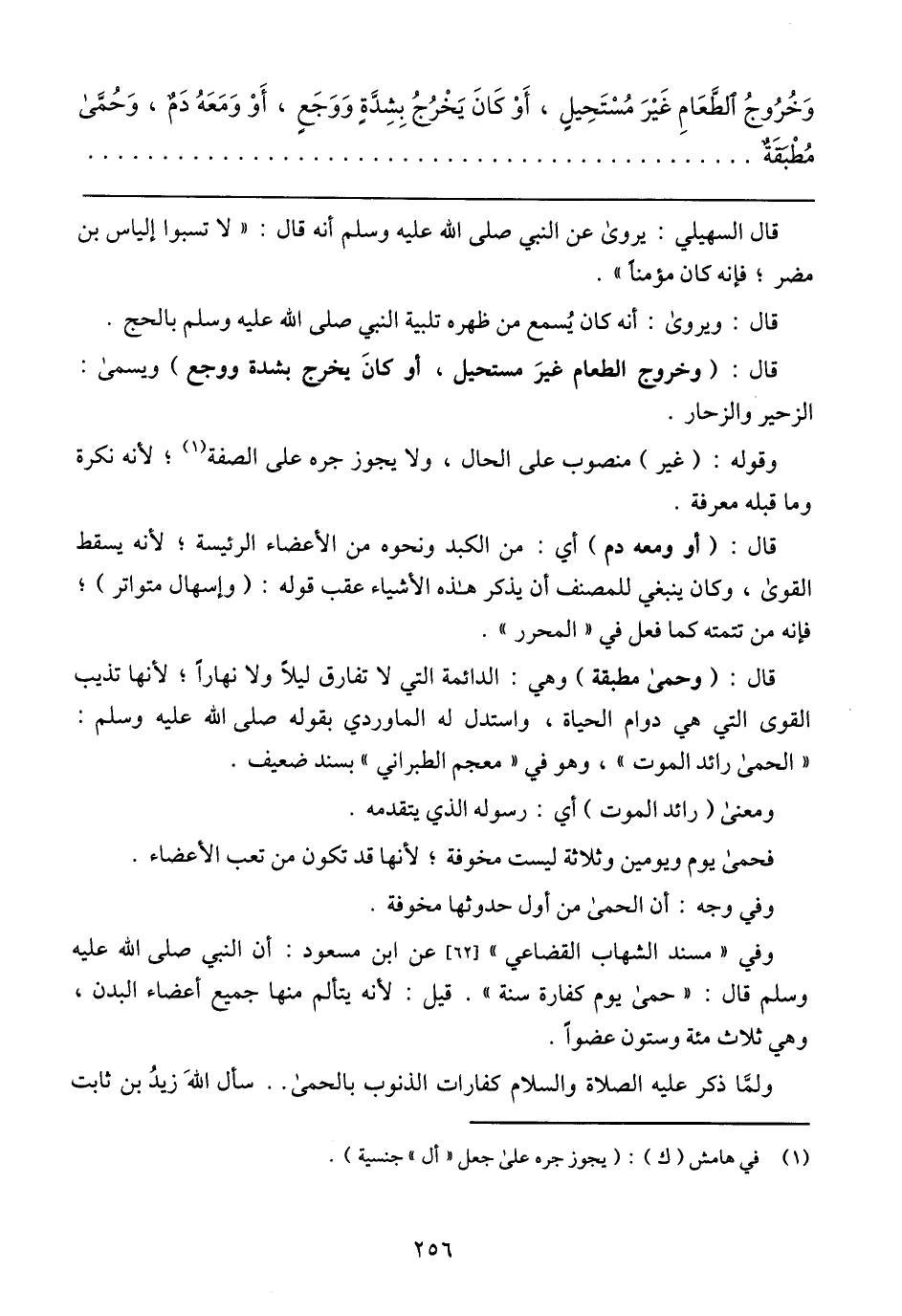 قال: (وحمى مطبقة) وهي: الدائمة التي لا تفارق ليلًا ولا نهارًا، لأنها تذيب القوى التي هي دوام الحياة، واستدل له الماوردي بقوله صلى الله عليه وسلم: (الحمى رائد الموت)، وهو في (معجم الطبراني) بسند ضعيف.