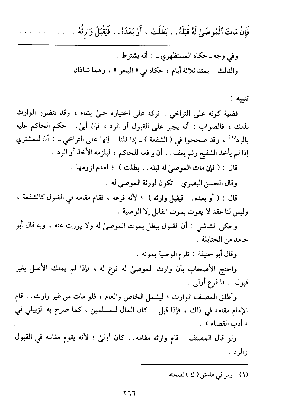 قضية كونه على التراخي: تركه على اختياره حتى يشاء، وقد يتضرر الوارث بذلك، فالصواب: أنه يجبر على القبول أو الرد، فإن أبى .. حكم الحاكم عليه بالرد، وقد صححوا في (الشفعة) –إذا قلنا: إنها على التراخي-:أن للمشتري إذا لم يأخذ الشفيع ولم يعف .. أن يرفعه للحاكم؛ ليلزمه الأخذ أو الرد.