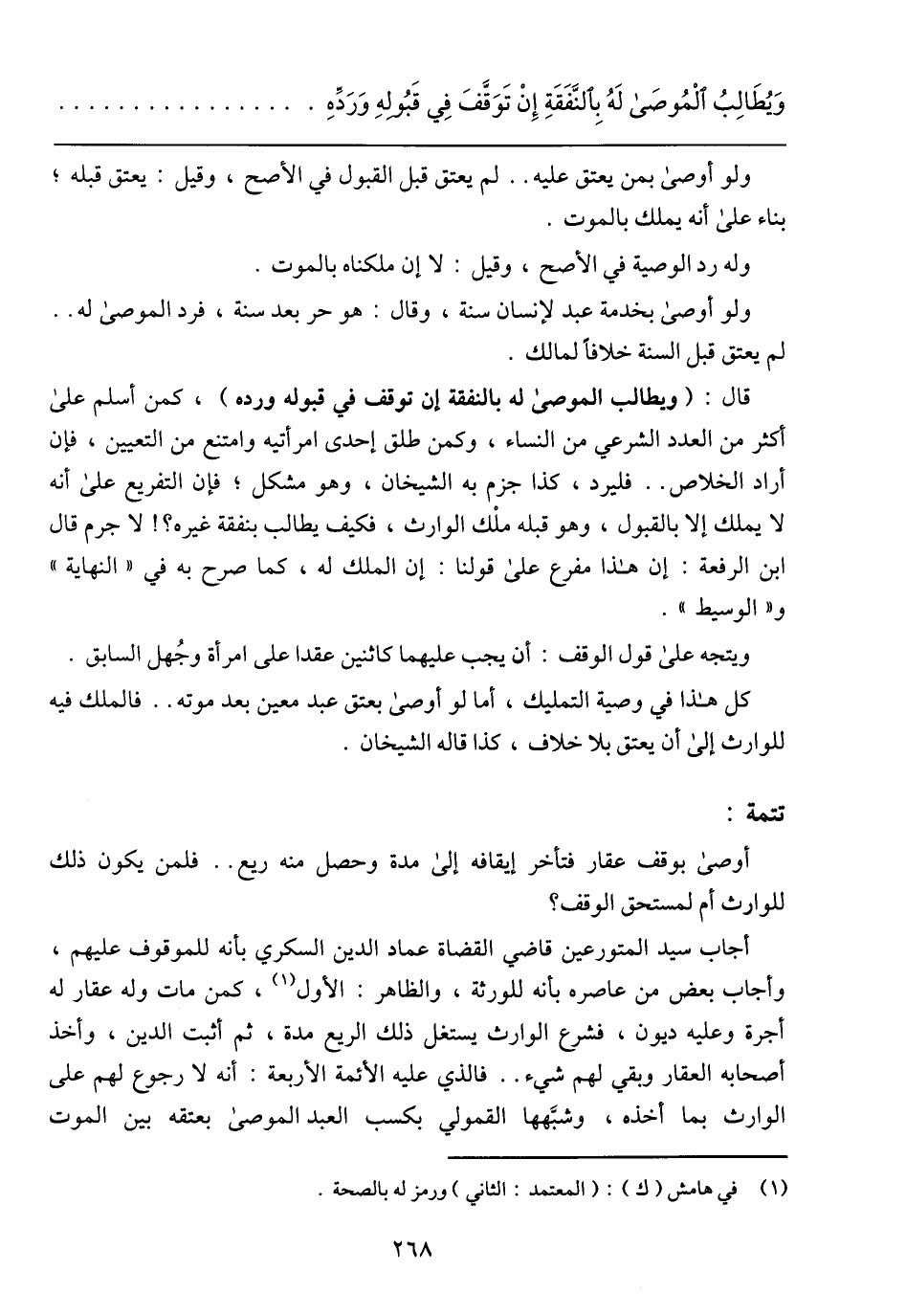 قال: (ويطالب الموصى له بالنفقة إن توقف في قبوله ورده)،كمن أسلم على أكثر من العدد الشرعي من النساء، وكمن طلق إحدى امرأتيه وامتنع من التعيين، فإن أراد الخلاص .. فليرد، كذا جزم به الشيخان، وهو مشكل؛ فإن التفريع على أنه لا يملك إلا بالقبول، وهو قبله ملك الوارث، فكيف يطالب بنفقة غيره؟! لا جرم قال ابن الرفعة: إن هذا مفرع على قولنا: إن الملك له، كما صرح به في (النهاية) و (الوسيط).