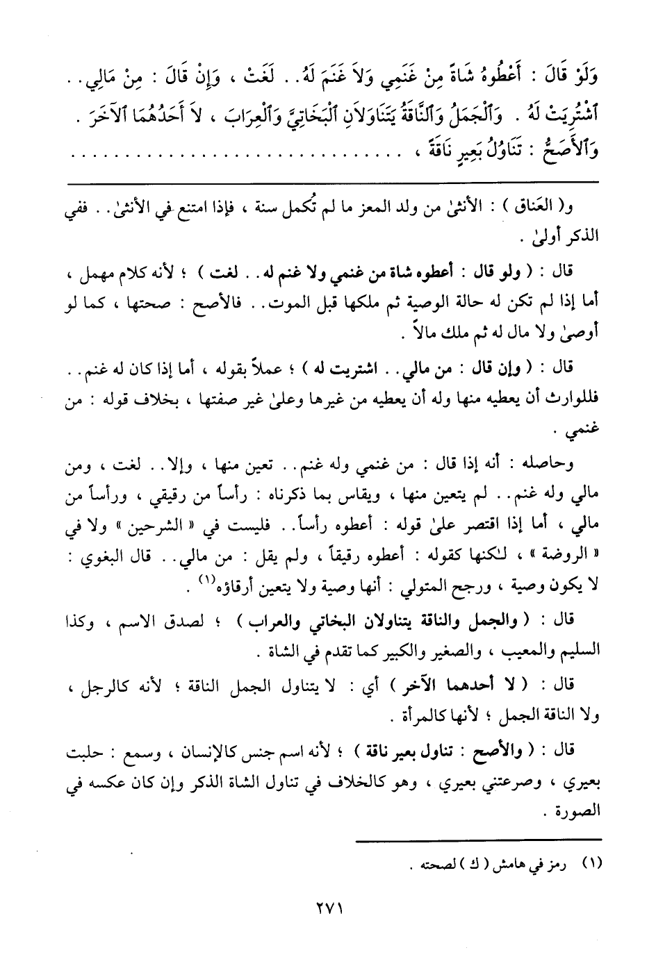 وَلَوْ قَالَ: أَعْطُوهُ شَاةٍ مِنْ غَنَمِي وَلاَ غَنَمَ لَهُ .. لَغَتْ، وَإِنْ قَالَ: مِنْ مَالِي .. اشْتُرِيَتْ لَهُ، وَالجَمَلُ وَالنَاقَةُ يَتَنَاوَلاَنِ الْبَخَاتِي? وَالْعِرَابَ، لاَ أَحَدُهُمَا الآخَرَ. وَالأَصَحُ: تَنَاوُلُ بَعِيرِ نَاقَةْ،