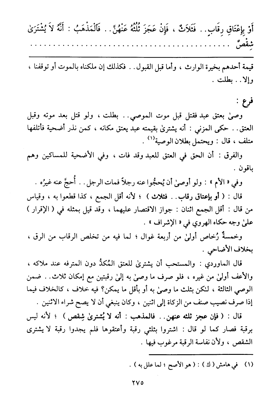 أَوْ بِإعْتَاقِ رِقَابٍ .. فَثَلاَثٌ، فَإِنْ عَجَزَ ثُلُثُهُ عَنْهُنَ .. فَالْمَذْهَبُ: أَنَهُ لاَ يُشْتَرَى شِقْصٌ