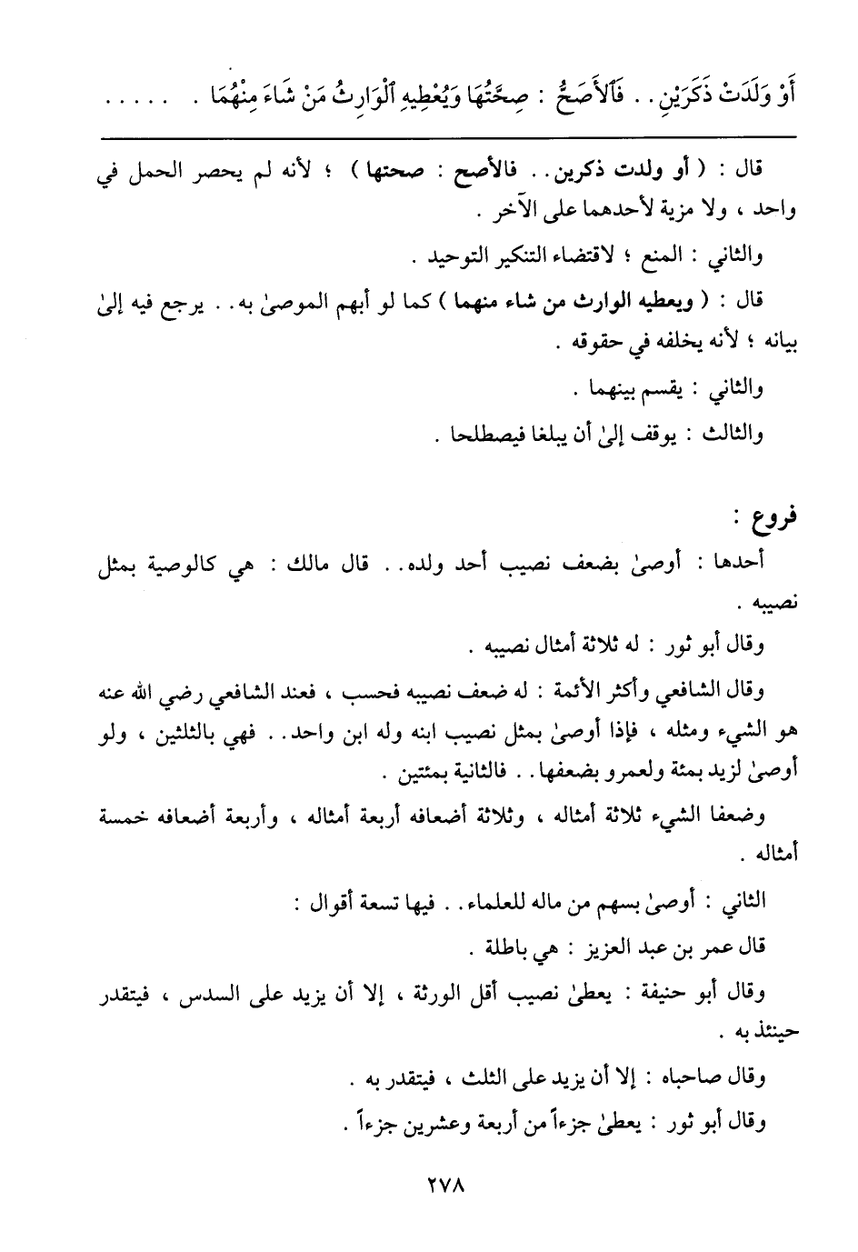 وقال الشافعي وأكثر الأئمة: له ضعف نصيبه فحسب، فعند الشافعي رضي الله عنه هو الشيء ومثله، فإذا أوصى بمثل نصيب ابنه وله ابن واحد .. فهي بالثلثين، ولو أوصى لزيد بمئة ولعمرو بضعفها .. فالثانية بمئتين.