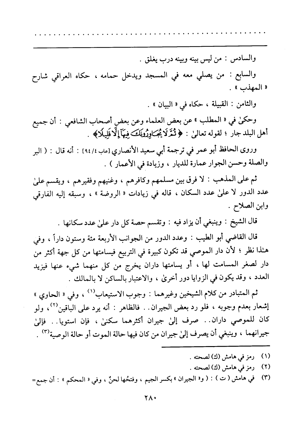 قال القاضي أبو الطيب: وعدد الدور من الجوانب الأربعة مئة وستون دارا، وفي هذا نظر؛ لأن دار الموصي قد تكون كبيرة في التربيع فيسامتها من كل جهة أكثر من دار لصغر المسامت لها، أو يسامتها داران يخرج من كل منهما شيء عنها فيزيد العدد، وقد يكون في الزوايا دور أخرى، والاعتبار بالساكن لا بالمالك.
