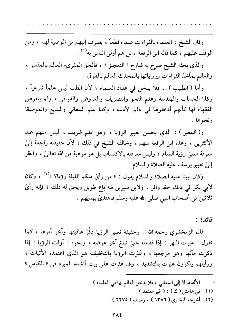 وأما (الطبيب) .. فلا يدخل في عداد العلماء؛ لأن الطب ليس علما شرعيا، وكذا الحساب والهندسة وعلم النحو والتصريف والعروض والقوافي، ولم يتعرض الفقهاء لها كأنهم أدخلوها في علم الأدب، وكذا علم المعاني والبديع والموسيقا ونحوها.