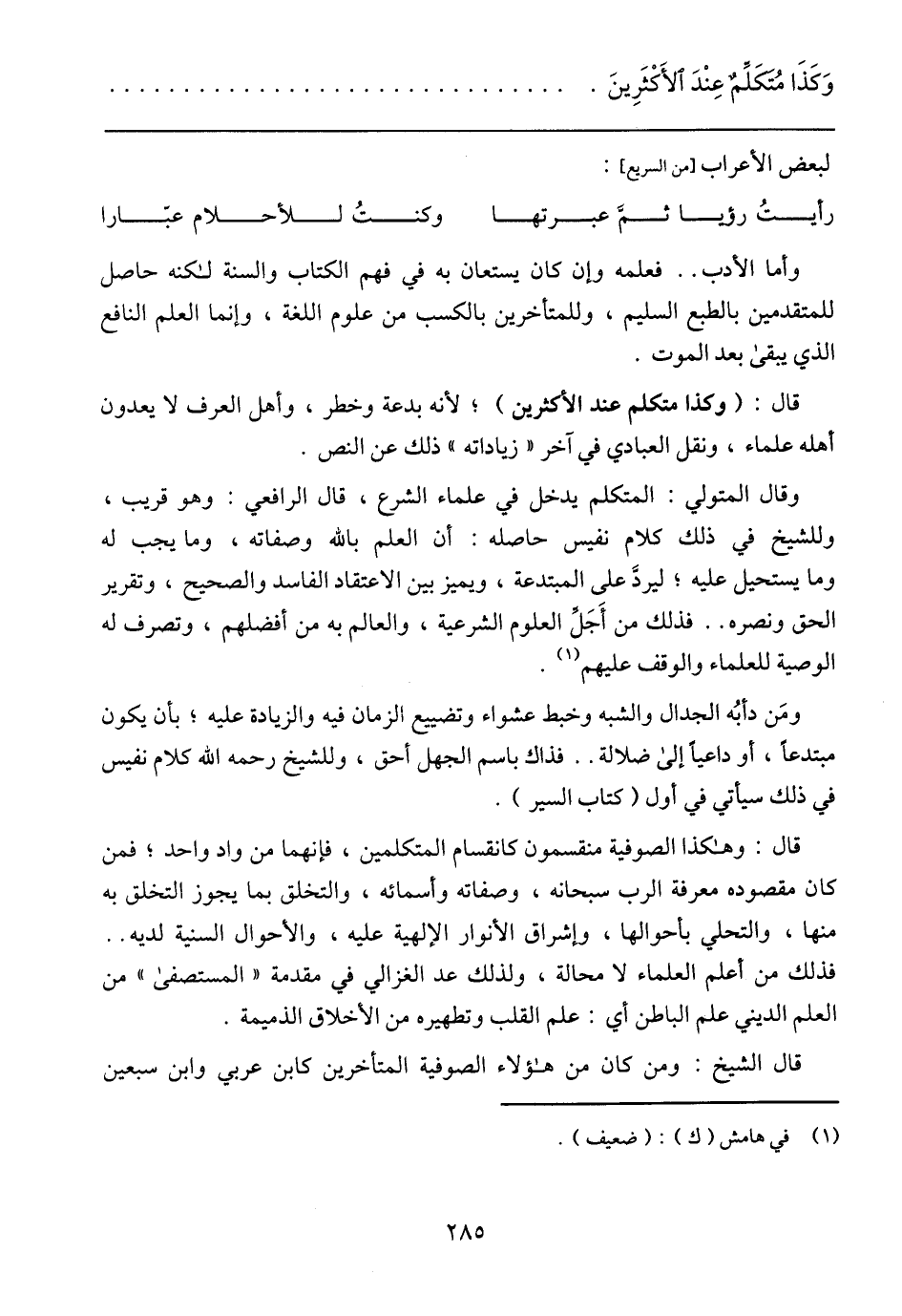قال: وهكذا الصوفية منقسمون كانقسام المتكلمين، فإنهما من واد واحد؛ فمن كان مقصوده معرفة الرب سبحانه، وصفاته وأسمائه، والتخلق بما يجوز التخلق به منها، والتحلي بأحوالها، وإشراق الأنوار الإلهية عليه، والأحوال السنية لديه .. فذلك من أعلم العلماء لا محالة، ولذلك عد الغزالي في مقدمة (المستصفى) من العلم الديني علم الباطن أي: علم القلب وتطهيره من الأخلاق الذميمة.