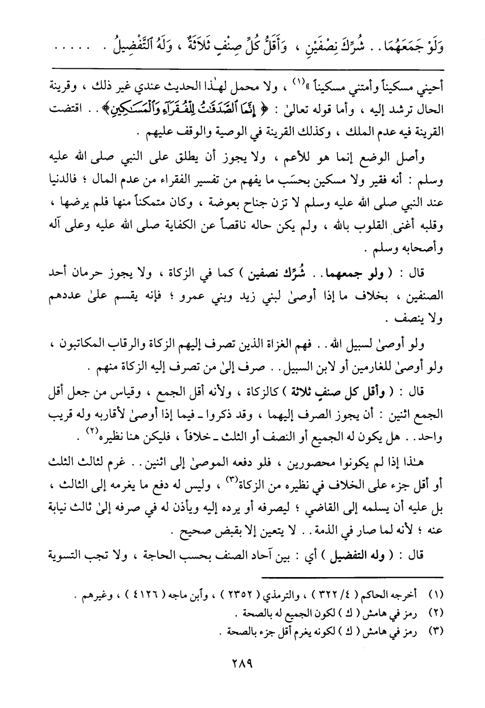 أحيني مسكينا وأمتني مسكينا)،ولا محمل لهذا الحديث عندي غير ذلك، وقرينة الحال ترشد إليه، وأما قوله تعالى:} إنما الصدقات للفقراء والمساكين {.. اقتضت القرينة فيه عدم الملك، وكذلك القرينة في الوصية والوقف عليهم.