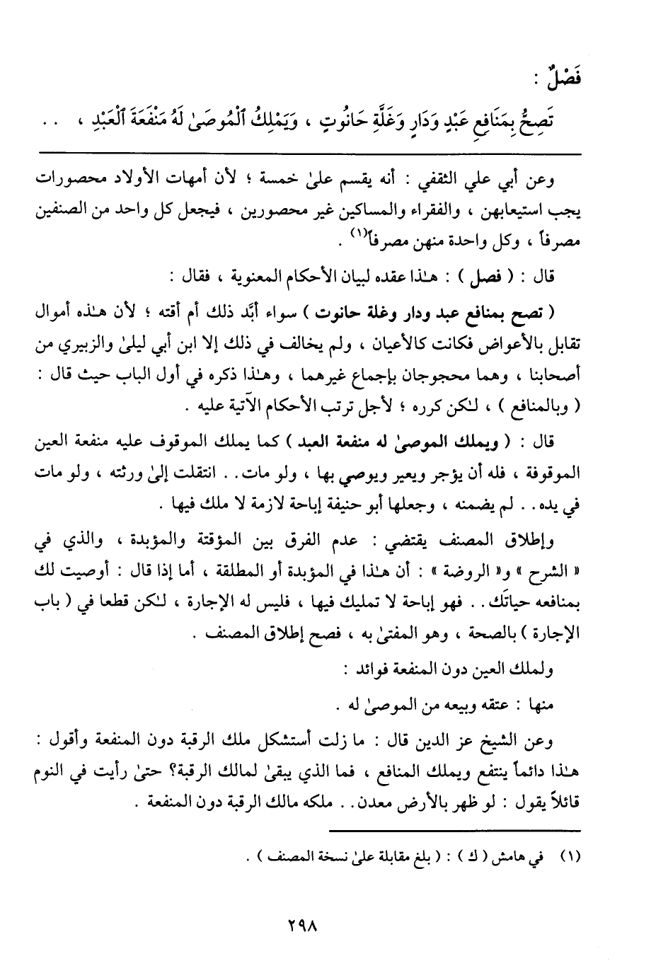 قال: (ويملك الموصى له منفعة العبد) كما يملك الموقوف عليه منفعة العين الموقوفة، فله أن يؤجر ويعير ويوصي بها، ولو مات في يده .. لم يضمنه، وجعلها أبو حنيفة إباحة لازمة لا ملك فيها.