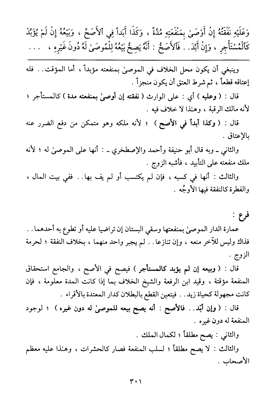 وَعَلَيْهِ نَفَقَتُهُ إِنْ أَوْصَى بِمَنْفَعَتِهِ مُدَةْ، وَكَذَا أَبَدا فِي الأَصَح?، وَبَيْعِهِ إِنْ لَمْ يُؤَبِدْ كَالمُسْتَأَجِرِ، وَإِنْ أَبَدَ .. فَالأَصَح?: أَنَهُ يَصِحُ بَيْعُهُ لِلمُوصَى لَهُ دُوْنَ غَيْرِهِ،