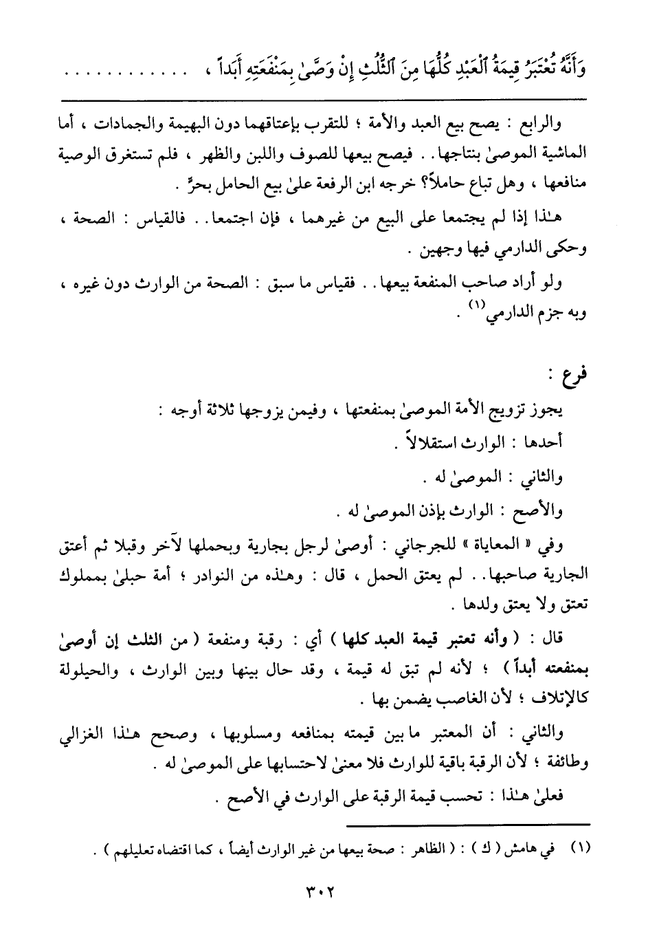 والرابع: يصح بيع العبد والأمة؛ للتقرب بإعتاقهما دون البهيمة والجمادات، أما الماشية الموصى بنتاجها .. فيصح بيعها للصوف واللبن والظهر، فلم تستغرق الوصية منافعها، وهل تباع حاملا؟ خرجه ابن الرفعة على بيع الحامل بحر.