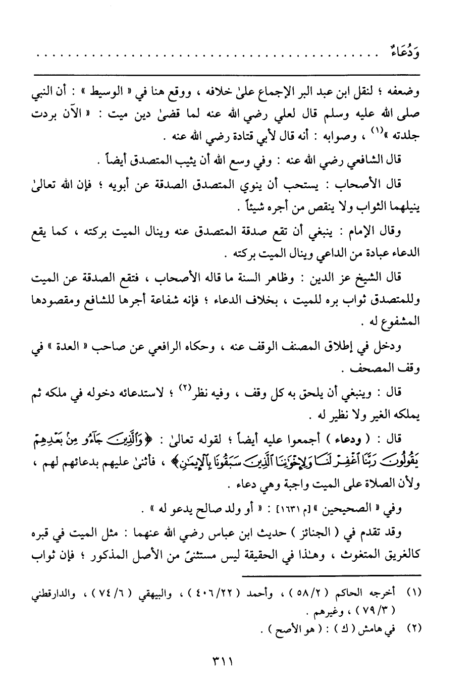 قال: (ودعاء) أجمعوا عليه أيضا؛ لقوله تعالى:} والذين جاءوا من بعدهم يقولون ربنا اغفر لنا ولإخواننا الذين سبقونا بالإيمان)،فأثنى عليهم بدعائهم لهم، ولأن الصلاة على الميت واجبة وهي دعاء.