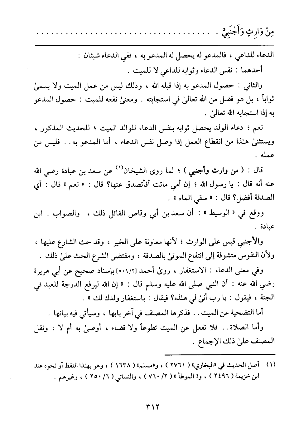 قال: (من وارث وأجنبي)؛لما روى الشيخان عن سعد بن عبادة رضي الله عنه أنه قال: يا رسول الله؛ إن أمي ماتت أفأتصدق عنها؟ قال: (نعم) قال: أي الصدقة أفضل؟ قال: (سقي الماء).