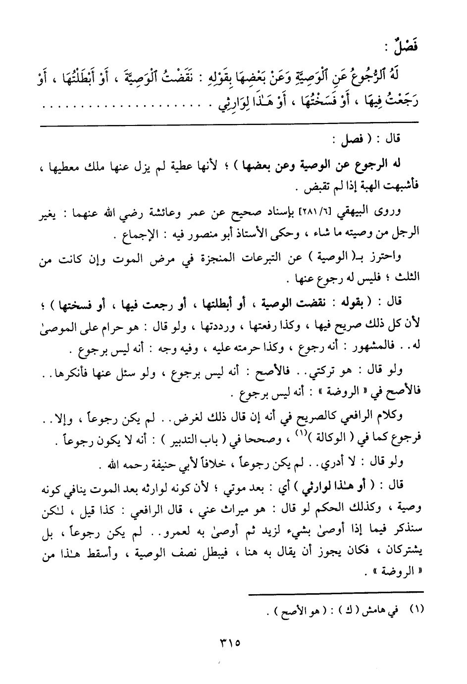 قال: (بقوله: نقضت الوصية، أو أبطلتها، أو رجعت فيها، أو فسختها)؛لأن كل ذلك صريح فيها، وكذا رفعتها، ورددتها، ولو قال: هو حرام على الموصى له .. فالمشهور: أنه رجوع، وكذا حرمته عليه، وفيه وجه: أنه ليس برجوع.