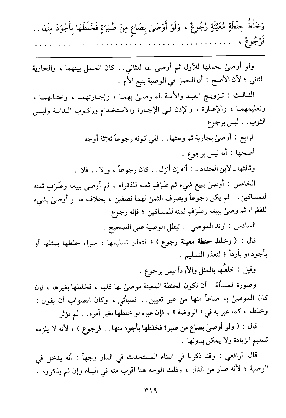 الخامس: أوصى ببيع شيء ثم صرف ثمنه للفقراء، ثم أوصى ببيعه وصرف ثمنه للمساكين .. لم يكن رجوعا ويصرف الثمن لهما نصفين، بخلاف ما لو أوصى بشيء للفقراء ثم وصى ببيعه وصرف ثمنه للمساكين؛ فإنه رجوع.