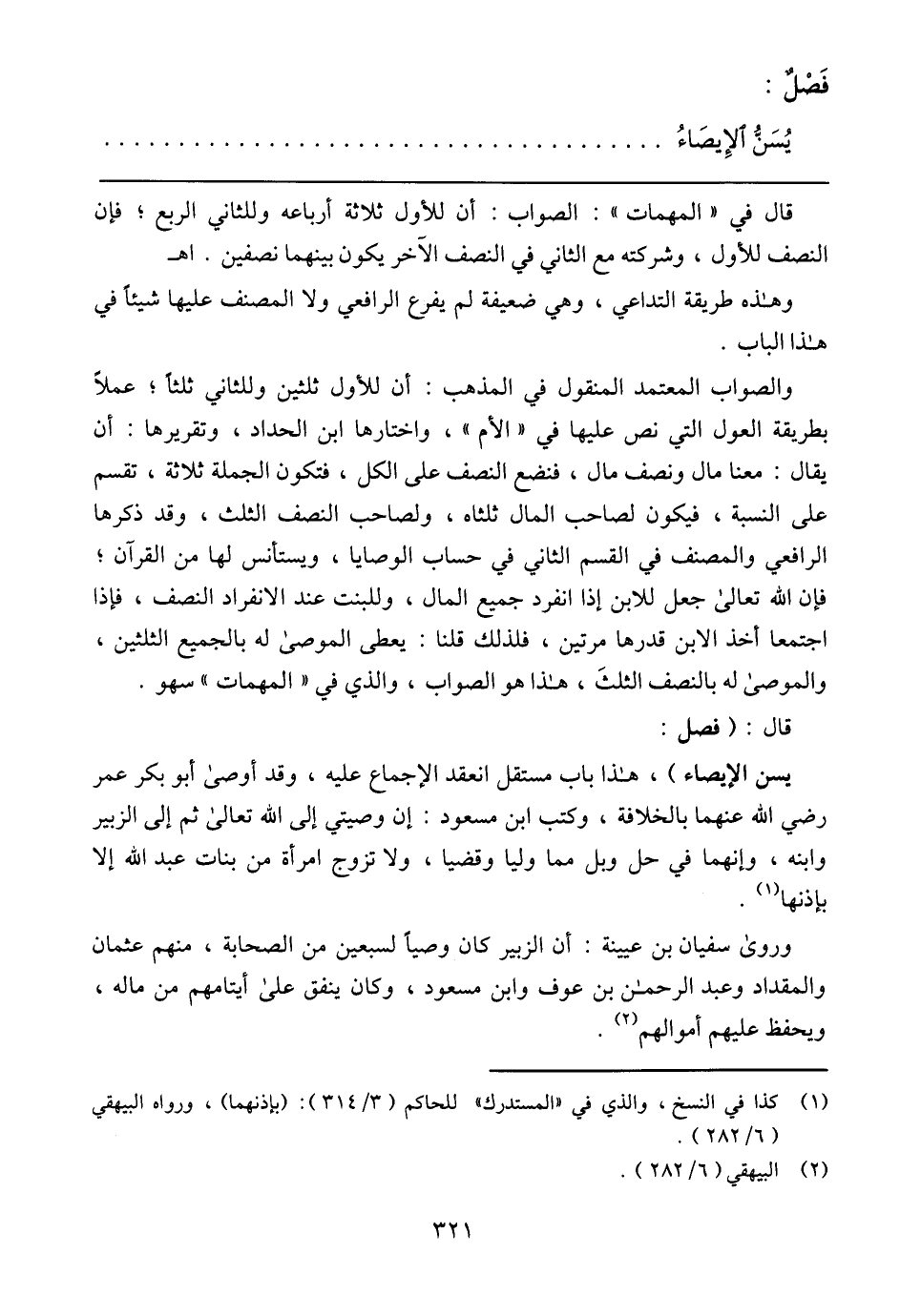 يسن الإيصاء)،هذا باب مستقل انعقد الإجماع عليه، وقد أوصى أبو بكر عمر رضي الله عنهما بالخلافة، وكتب ابن مسعود: إن وصيتي إلى الله تعالى ثم إلى الزبير وابنه، وإنهما في حل وبل مما وليا وقضيا، ولا تزوج امرأة من بنات عبدالله إلا بإذنها.