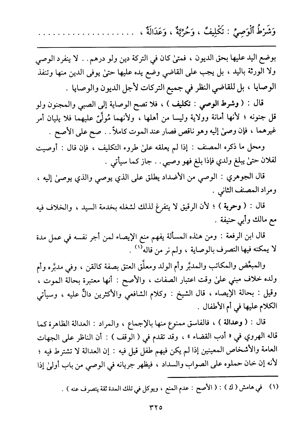 قال: (وعدالة)،فالفاسق ممنوع منها بالإجماع، والمراد: العدالة الظاهرة كما قاله الهروي في (أدب القضاء)،وقد تقدم في (الوقف):أن الناظر على الجهات العامة والأشخاص المعينين إذا لم يكن فيهم طفل قيل فيه: إن العدالة لا تشترط فيه؛ لأنه إن خان حملوه على الصواب والسداد، فيظهر جريانه في الوصي من باب أولى إذا