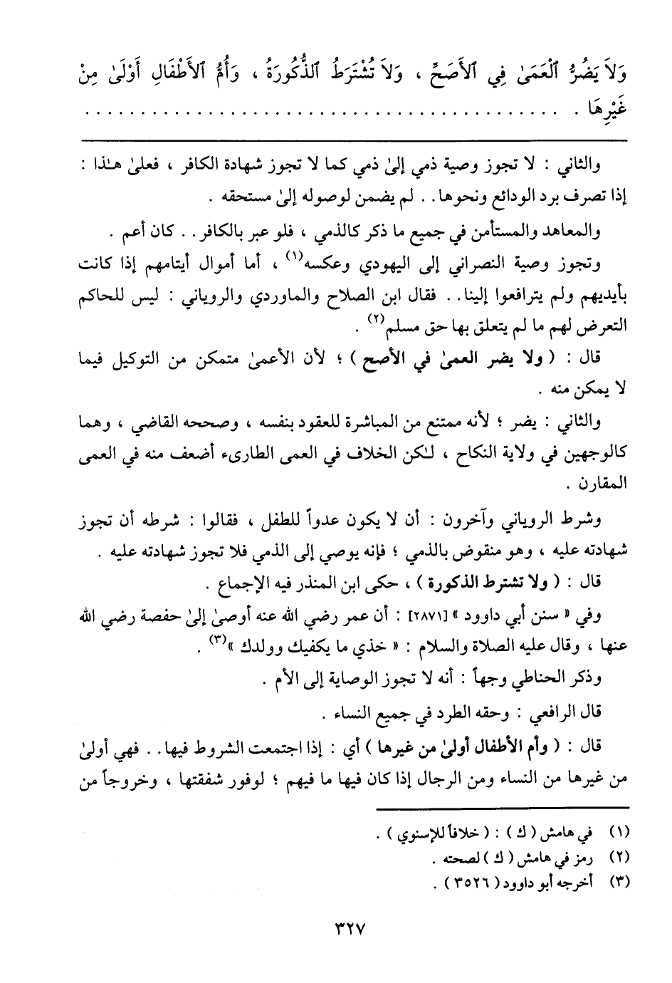 وتجوز وصية النصراني إلى اليهودي وعكسه، أما أموال أيتامهم إذا كانت بأيديهم ولم يترفعوا إلينا .. فقال ابن الصلاح والماوردي والروياني: ليس للحاكم التعرض لهم ما لم يتعلق بها حق مسلم.