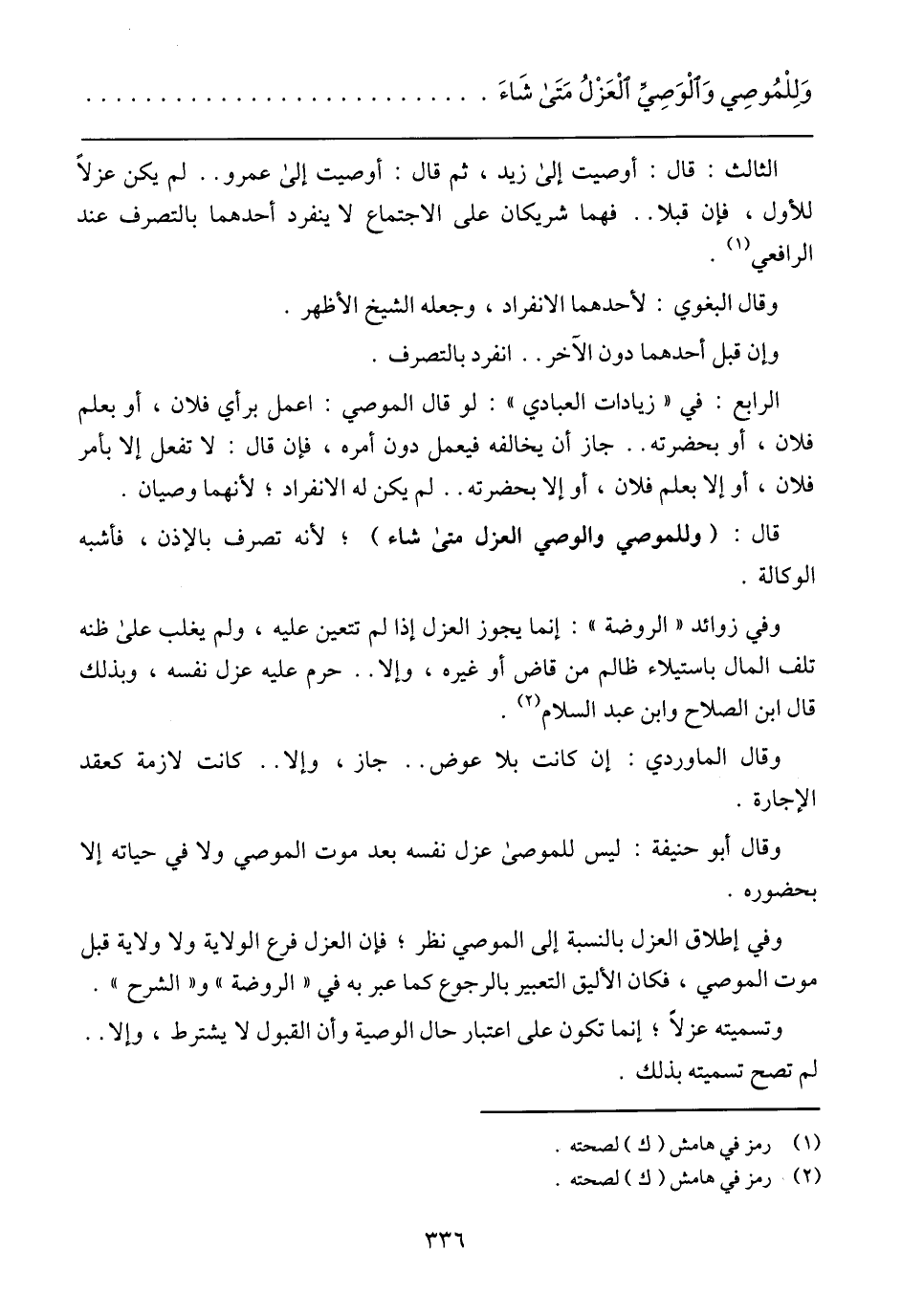 الثالث: قال: أوصيت إلى زيد، ثم قال: أوصيت إلى عمرو .. لم يكن عزلا للأول، فإن قبلا .. فهما شريكان على الاجتماع لا ينفرد أحدهما بالتصرف عند الرافعي.