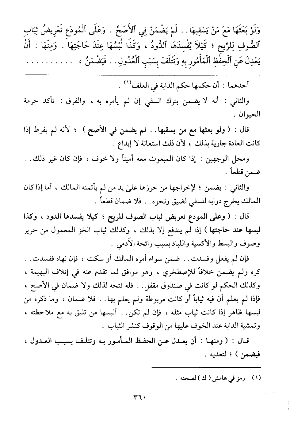 فإن لم يفعل وفسدت .. ضمن سواء أمره المالك أو سكت، فإن نهاه ففسدت .. كره ولم يضمن خلافًا للإصطخري، وهو موافق لما تقدم عنه في إتلاف البهيمة، وكذلك الحكم لو كانت في صندوق مقفل .. فله فتحه لذلك ولا ضمان في الأصح، فإذا لم يعلم أن فيه ثيابًا أو كانت مربوطة ولم يعلم بها .. فلا ضمان، وما ذكره من لبسها ظاهر إذا كانت ثياب مثله، فإن لم تكن .. ألبسها من تليق به مع ملاحظته، وتمشية الدابة عند الخوف عليها من الوقوف كنشر الثياب.