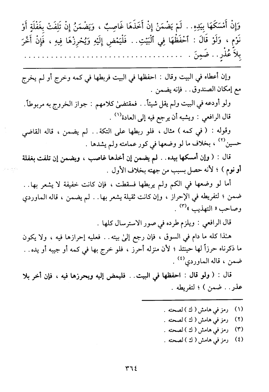 وَإِنْ أَمْسَكَهَا بِيَدِهِ .. لَمْ يَضْمَنْ إِنْ أَخَذَهَا غَاصِبٌ، وَيَضْمَنُ إِنْ تَلِفَتْ بِغَفْلَةٍ أَوْ نَوْمٍ، وَلَوْ قَالَ: احْفَظْهَا فِي الْبَيْتِ .. فَلْيَمْضِ إِلَيْهِ وَيُحْرِزْهَا فِيهِ، فَإِنْ أَخَّرَ بِلاَ عُذْرٍ .. ضَمِنَ