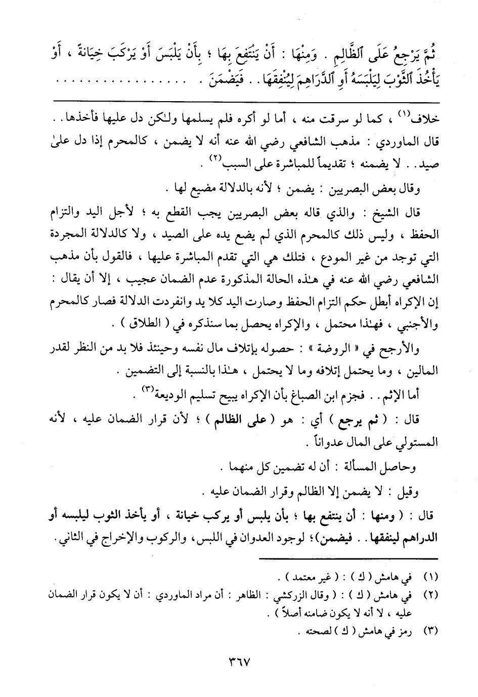 ثُمَّ يَرْجِعُ عَلَى الظَّالِمِ. وَمِنْهَا: أَنْ يَنْتَفِعَ بِهَا؛ بِأَنْ يَلْبَسَ أَوْ يَرْكَبَ خِيَانةً، أَوْ يَاخُذَ الثَّوْبَ لِيَلْبَسَهُ أَوِ الدَّرَاهِمَ لِيُنْفِقَهَا .. فَيَضْمَنَ