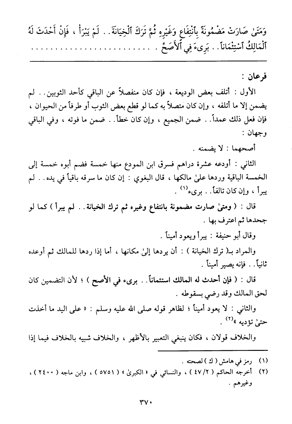 الأول: أتلف بعض الوديعة، فإن كان منفصلاً عن الباقي كأحد الثوبين .. لم يضمن إلا ما أتلفه، وإن كان متصلاً به كما لو قطع بعض الثوب أو طرفًا من الحيوان، فإن فعل ذلك عمدًا .. ضمن الجميع، وإن كان خطأ .. ضمن ما فوته، وفي الباقي وجهان: