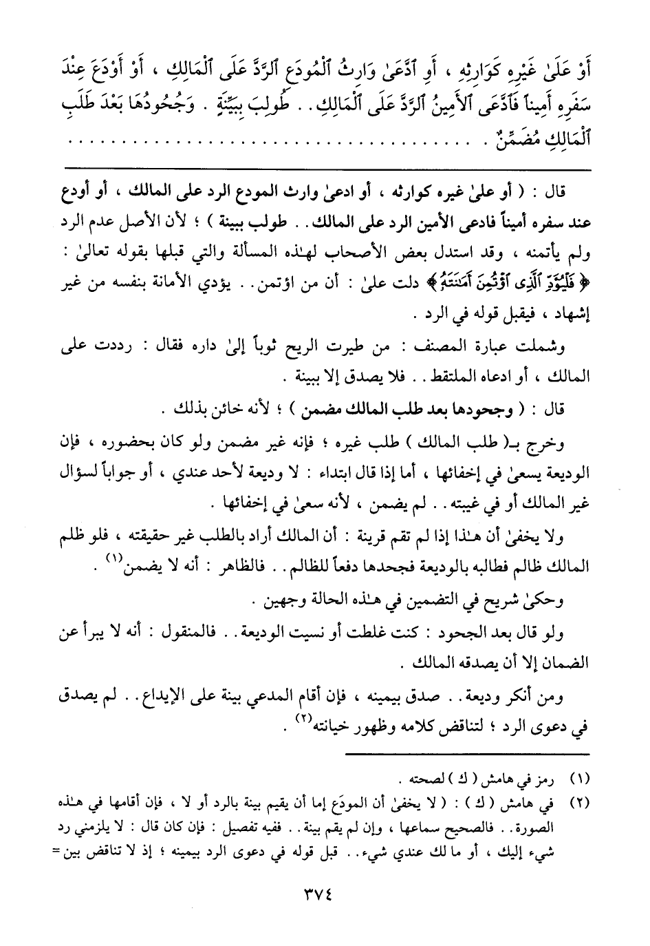 أَوْ عَلَى غَيْرِهِ كَوَرَاثِهِ، أَوْ ادَّعَى وَارِثُ الْمُودِعِ الْرَّدَّ عَلَى الْمَالِكِ، أَوْ أَوْدَعَ عِنْدَ سَفَرِهِ أَمِيناً فَادَّعَى الأَمِينُ الْرَّدَّ عَلَى الْمَالِكِ .. طُولِبَ بِبَيِّنَةٍ. وَجُحُودُهَا بَعْدَ طَلَبِ الْمَالِكِ مُضَمِّنٌ