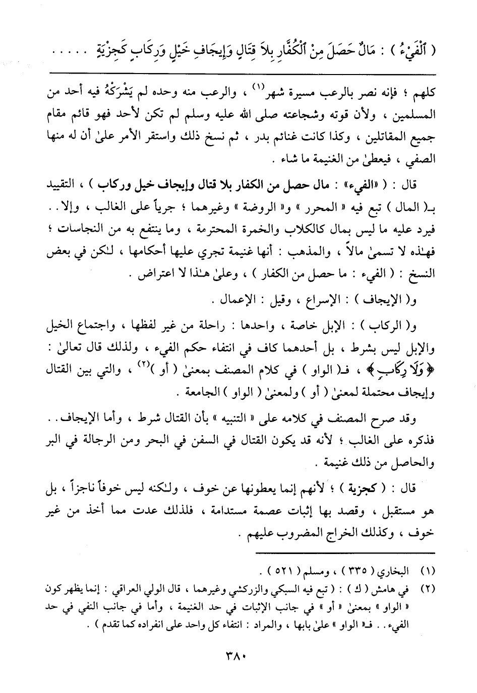 قال: ((الفيء): مال حصل من الكفار بلا قتال وإيجاف خيل وركاب)، التقييد بـ (المال) تبع فيه (المحرر) و (الروضة) وغيرهما؛ جريًا على الغالب، وإلا .. فيرد عليه ما ليس بمال كالكلاب والخمرة المحترمة، وما ينتفع به من النجاسات؛ فهذه لا تسمى مالاً، والمذهب: أنها غنيمة تجري عليها أحكامها، لكن في بعض النسخ: (الفيء: ما حصل من الكفار)، وعلى هذا لا اعتراض.