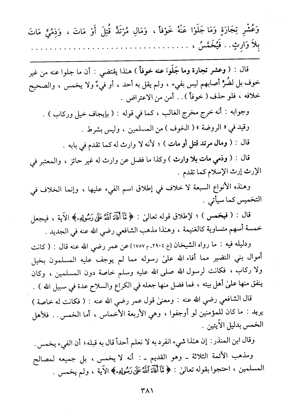 قال الشافعي رضي الله عنه: ومعنى قول عمر رضي الله عنه: (فكانت له خاصة) يريد: ما كان للمؤمنين لو أوجفوا، وهي الأربعة الأخماس، أما الخمس .. فلأهل الخمس بدليل الآيتين.