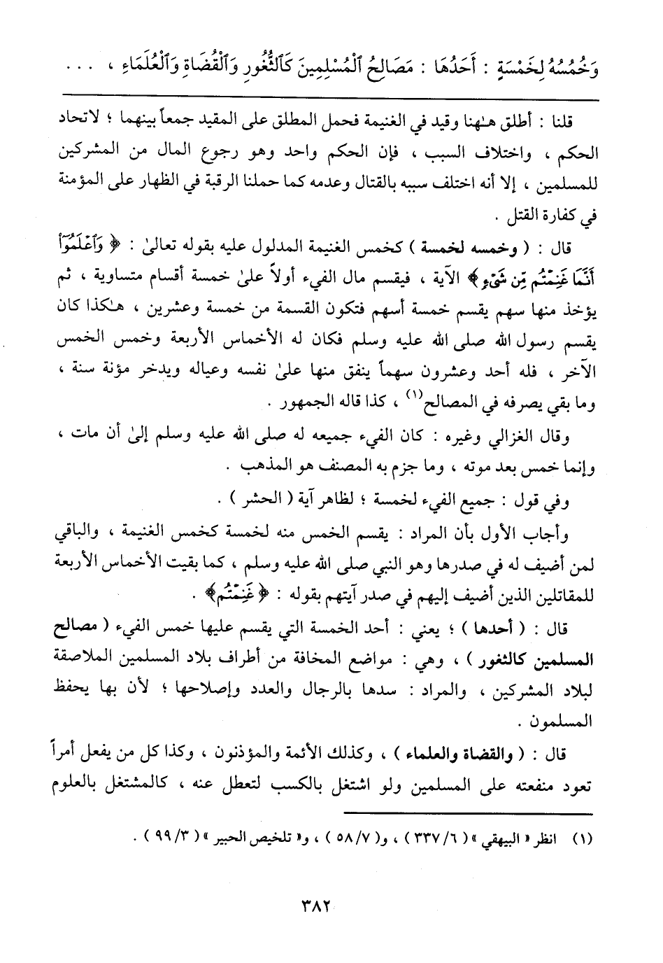 وَخُمُسُهُ لِخَمْسَةٍ: أَحَدُهَا: مَصَالِحُ الْمُسْلِمِينَ كَالْثُّغُورِ وَالْقُضَاةِ وَالْعُلَمَاءِ،