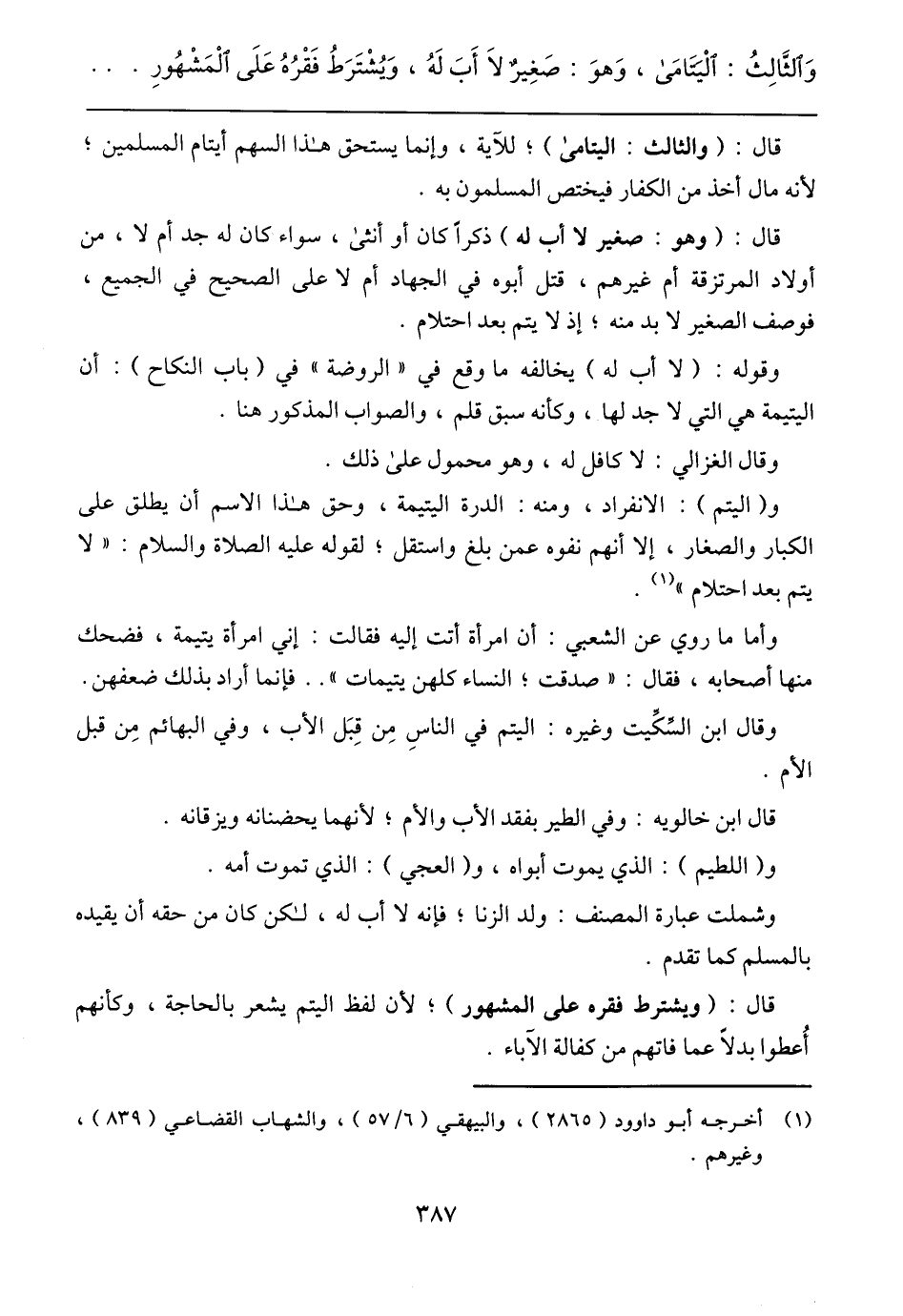 وَالثِّالِثُ: الْيَتَامَى، وَهوَ: صَغِيرٌ لاَ أَبَ لَهُ، وَيُشْتَرَطُ فَقْرُهُ عَلَى الْمَشْهُورِ