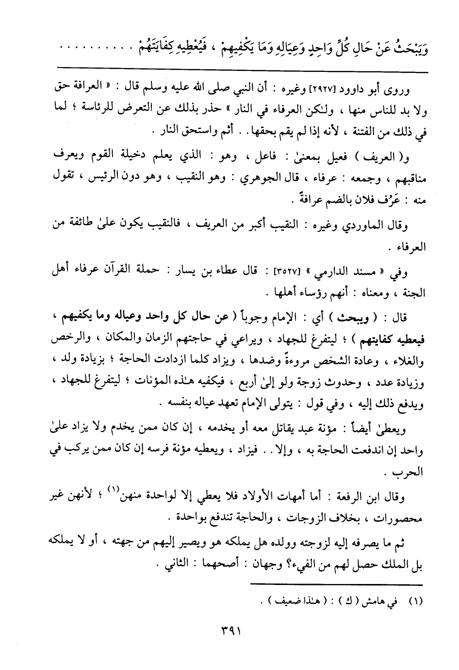 قال: (ويبحث) أي: الإمام وجوبًا (عن حال كل واحد وعياله وما يكفيهم، فيعطيه كفايتهم)؛ ليتفرغ للجهاد، ويراعي في حاجتهم الزمان والمكان، والرخص والغلاء، وعادة الشخص مروءةً وضدها، ويزداد كلما ازدادت الحاجة؛ بزيادة ولد، وزيادة عدد، وحدوث زوجة ولو إلى أربع، فيكفيه هذه المؤنات؛ ليتفرغ للجهاد، ويدفع ذلك إليه، وفي قول: يتولى الإمام تعهد عياله بنفسه.