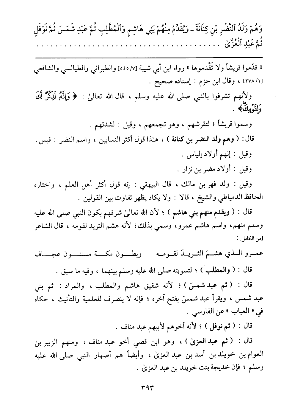 وَهُمْ وَلَدُ النَّضْرِ بنِ كِنَانَةَ - وَيُقَدِّمُ مِنْهُمْ بَنِي هَاشِمٍ وَالْمُطَّلِبِ ثُمَّ عَبْدِ شَمَسَ ثُمَّ نَوْفَلٍ ثُمَّ عَبْدِ الْعُزَّى