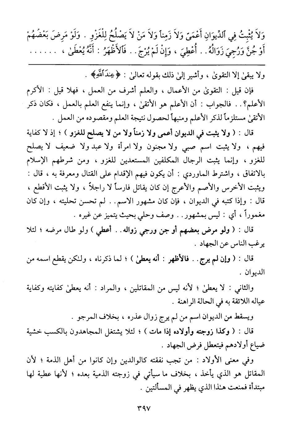 وَلاَ يُثْبِتُ فِي الدِّيوَانِ أَعْمَى وَلاَ زَمِنا وَلاَ مَنْ لاَ يَصْلُحُ لِلْغَزْوِ. وَلَوْ مَرِضَ بَعْضُهُمْ أَوْ جُنَّ وَرُجِيَ زَوَالُهُ .. أُعْطِيَ، وَإِنْ لَمْ يُرْجَ .. فَالأَظْهَرُ: أَنَّهُ يُعْطَى،