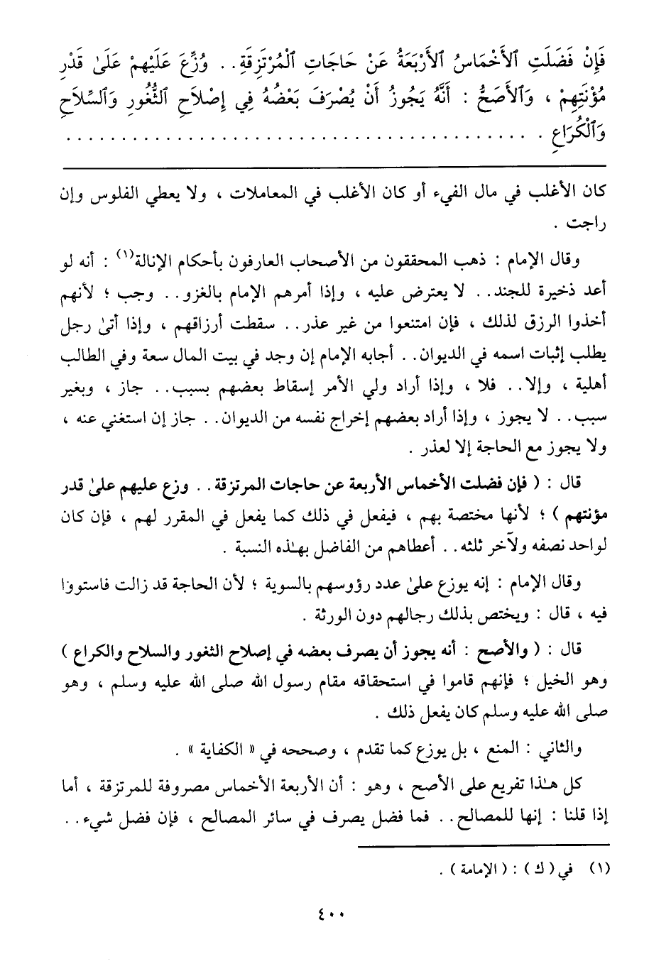 فَإِنْ فَضَلَتِ الأَخْمَاسُ الأَرْبَعَةُ عَنْ حَاجَاتِ الْمُرْتَزِقَةِ .. وُزِّعَ عَلَيْهم عَلَى قَدْرِ مُؤْنَتِهِمْ، وَالأَصَحُّ: أَنَّهُ يَجُوزُ أَنْ يُصْرَفَ بَعْضُهُ فِي إِصْلاَحِ الثُغُورِ وَالسِّلاَحِ وَالكُرَاعِ