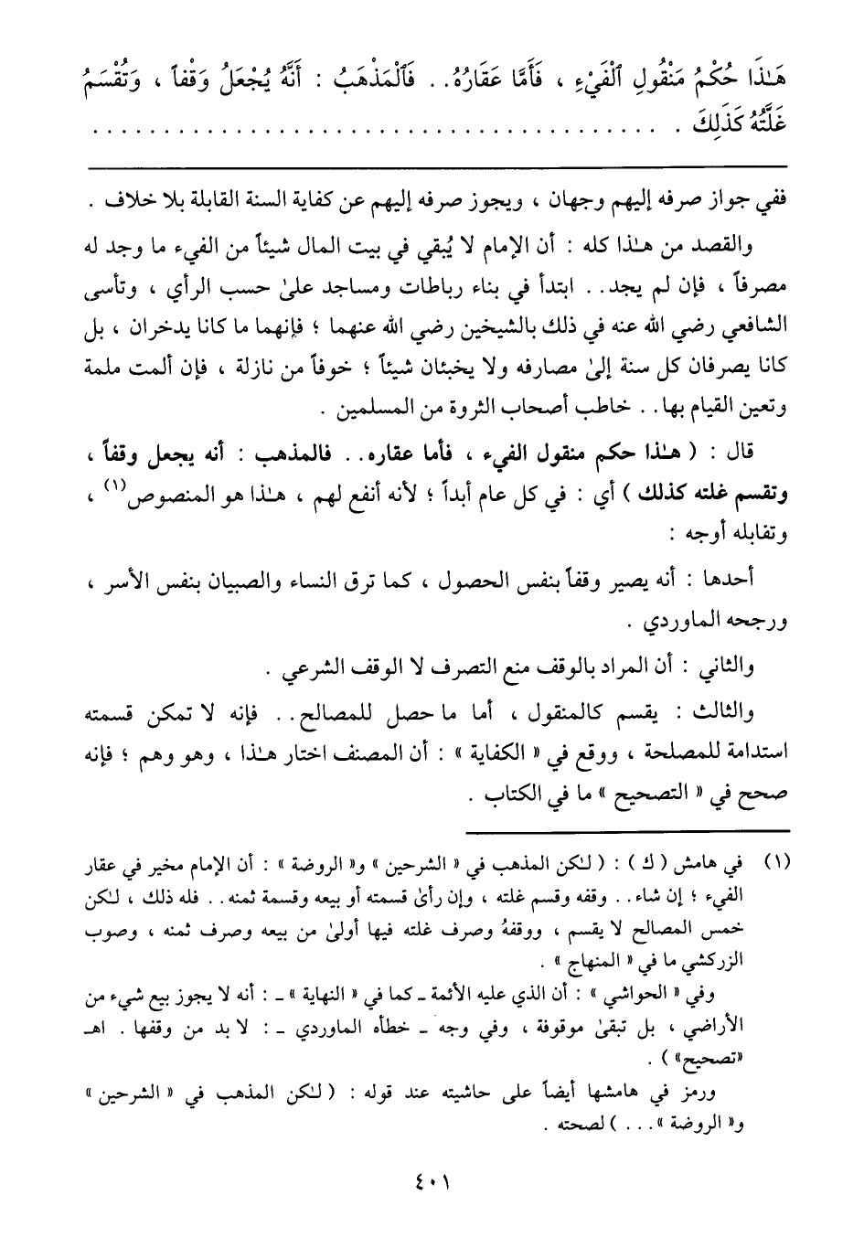 قال: (هذا حكم منقول الفيء، فأما عقاره .. فالمذهب: أنه يجعل وقفًا، وتقسم غلته كذلك) أي: في كل عام أبدًا؛ لأنه أنفع لهم، هذا هو المنصوص، وتقابله أوجه: