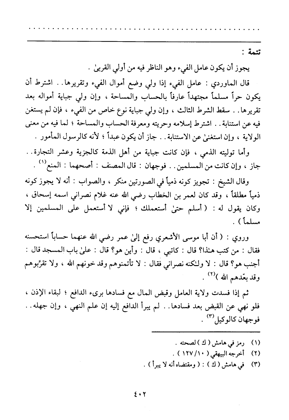 وقال الشيخ: تجويز كونه ذميًا في الصورتين منكر، والصواب: أنه لا يجوز كونه ذميًا مطلقًا، وقد كان لعمر بن الخطاب رضي الله عنه غلام نصراني اسمه إسحاق، وكان يقول له: (أسلم حتى أستعملك؛ فإني لا أستعمل على المسلمين إلا مسلمًا).