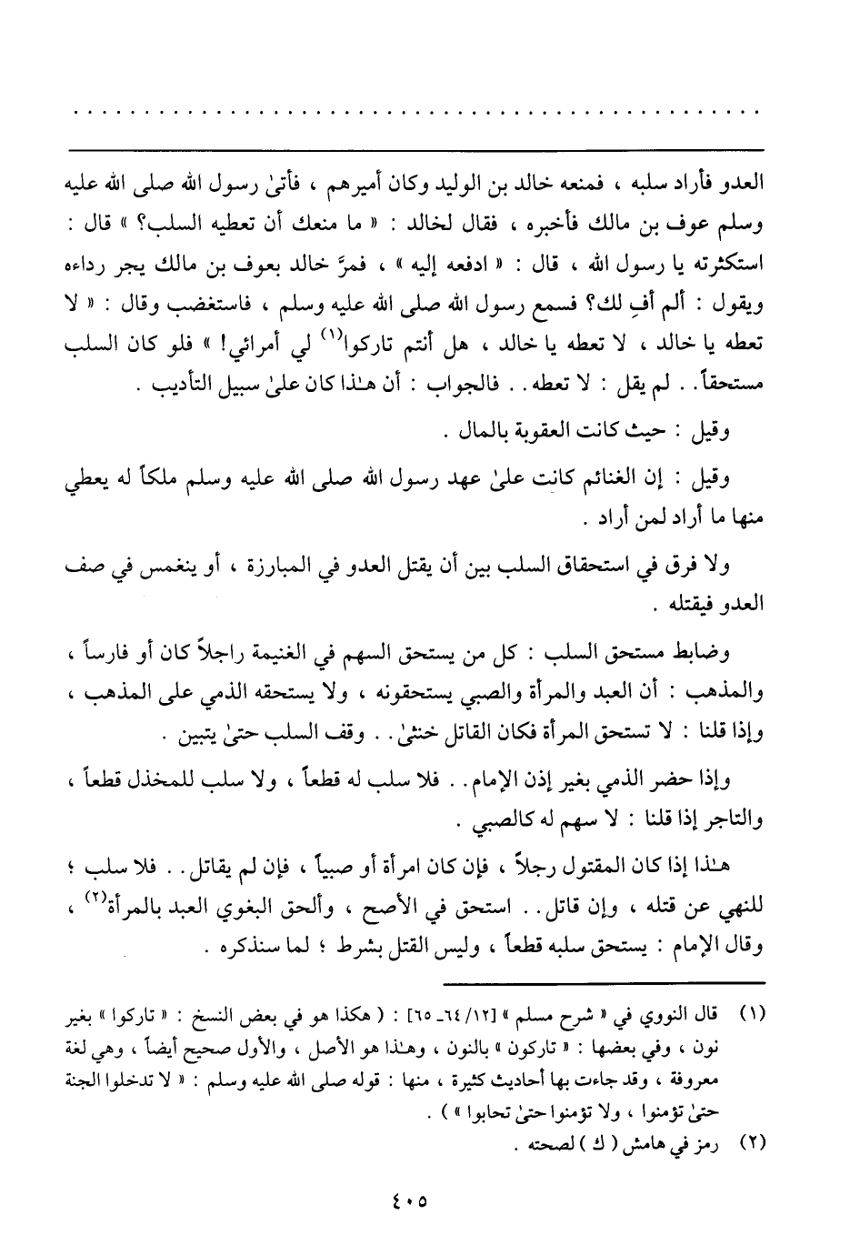 العدو فأراد سلبه، فمنعه خالد بن الوليد وكان أميرهم، فأتى رسول الله صلى الله عليه وسلم عوف بن مالك فأخبره، فقال لخالد: (ما منعك أن تعطيه السلب؟) قال: استكثرته يا رسول الله، قال: (ادفعه إليه)، فمرَّ خالد بعوف بن مالك يجر رداءه ويقول: ألم أفِ لك؟ فسمع رسول الله صلى الله عليه وسلم، فاستغضب وقال: (لا تعطه يا خالد، لا تعطه يا خالد، هل أنتم تاركوا لي أمرائي!) فلو كان السلب مستحقًا .. لم يقل: لا تعطه .. فالجواب: أن هذا كان على سبيل التأديب.