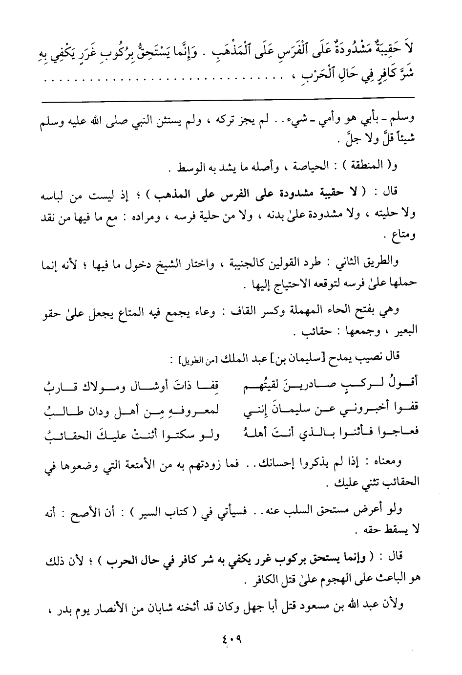 لاَ حَقِيبَةٌ مَشْدُودَةٌ عَلَى اَلْفَرَسِ عَلَى اَلْمَذْهَبِ. وَإِنَّما يَسْتَحِقُ بِرُكُوبِ غَرَرٍ يَكْفِي بِهِ شَرَّ كَافِرٍ فِي حَالِ اَلْحَرْبِ,