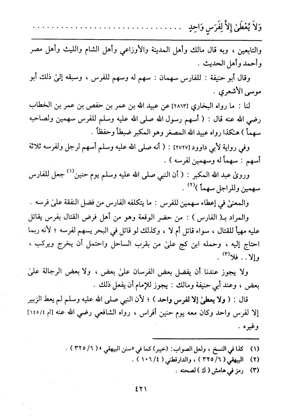 وَلاَ يُعْطَى إِلاَّ لِفَرَسٍ وَاحِدٍ