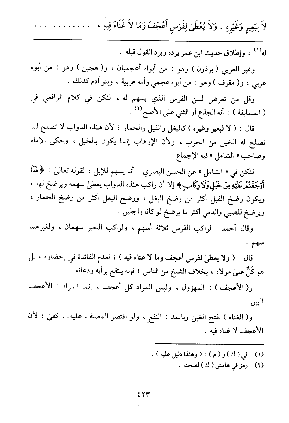 لاَ لِبَعيرٍ وَغَيْرِهِ. وَلاَ يُعْطَى لِفَرَسٍ أَعْجَفَ وَمَا لاَ غِنَاءَ فِيهِ,