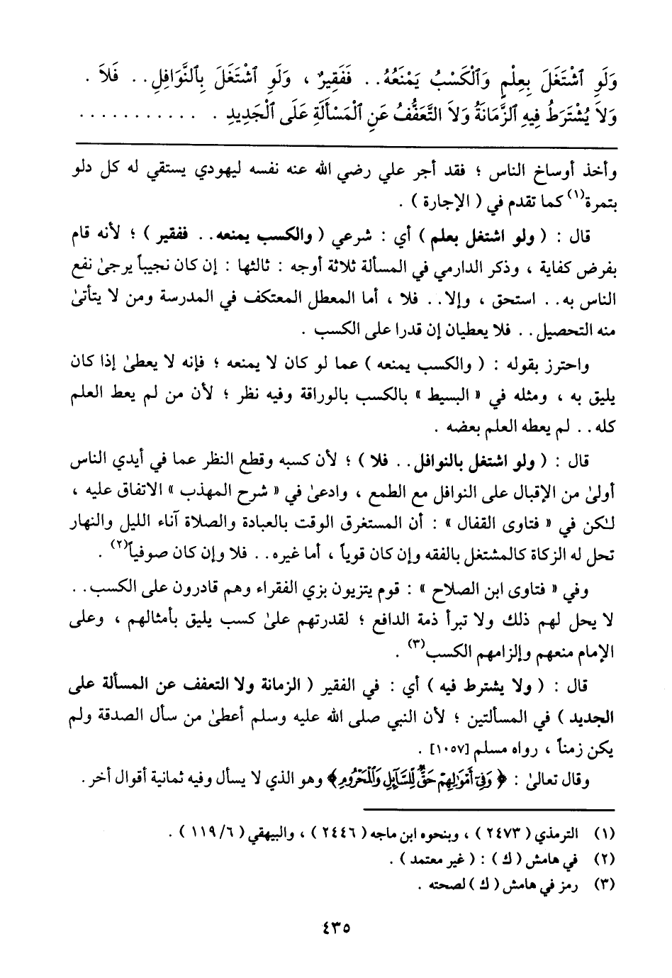 وَلَوِ اشْتَغَلَ بِعِلْمٍ وَالْكَسْبُ يَمْنَعُهُ .. فَفَقِيرٌ، وَلَوِ اشْتَغَلَ بِالنَّوَافِلِ .. فَلاَ. وَلاَ يُشْتَرَطُ فِيهِ الزَّمَانَةُ وَلاَ التَّعَفُّفُ عَنِ الْمَسْأَلَةِ عَلَى الْجَدِيدِ