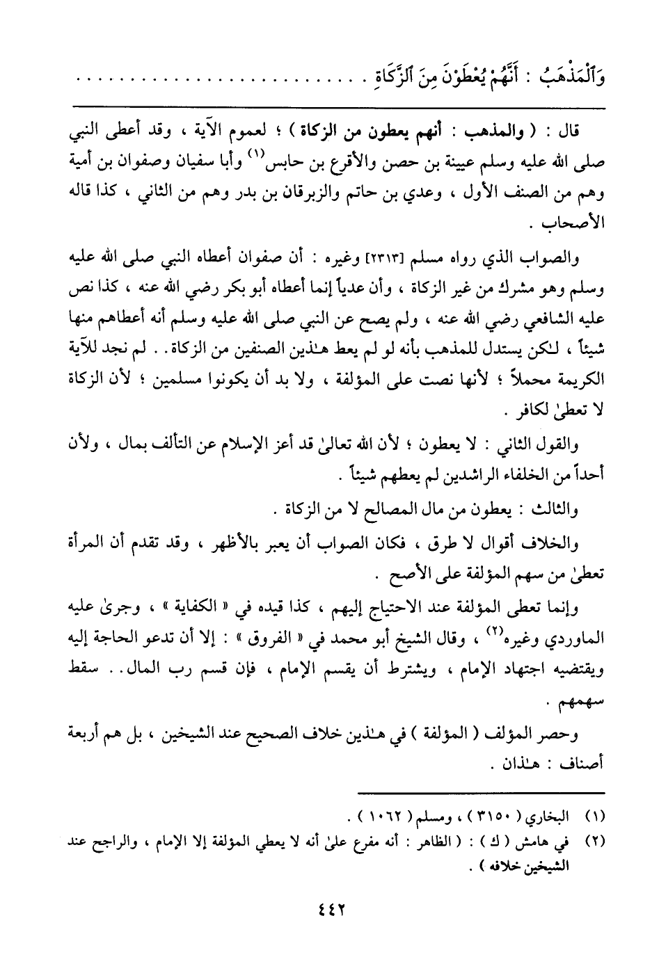 والصواب الذي رواه مسلم وغيره: أن صفوان أعطاه النبي صلى الله عليه وسلم وهو مشرك من غير الزكاة، وأن عديًا إنما أعطاه أبو بكر رضي الله عنه، كذا نص عليه الشافعي رضي الله عنه، ولم يصح عن النبي صلى الله عليه وسلم أنه أعطاهم منها شيئًا، لكن يستدل للمذهب بأنه لو لم يعط هذين الصنفين من الزكاة .. لم نجد للآية الكريمة محملاً؛ لأنها نصت على المؤلفة، ولابد أن يكونوا مسلمين؛ لأن الزكاة لا تعطى لكافر.