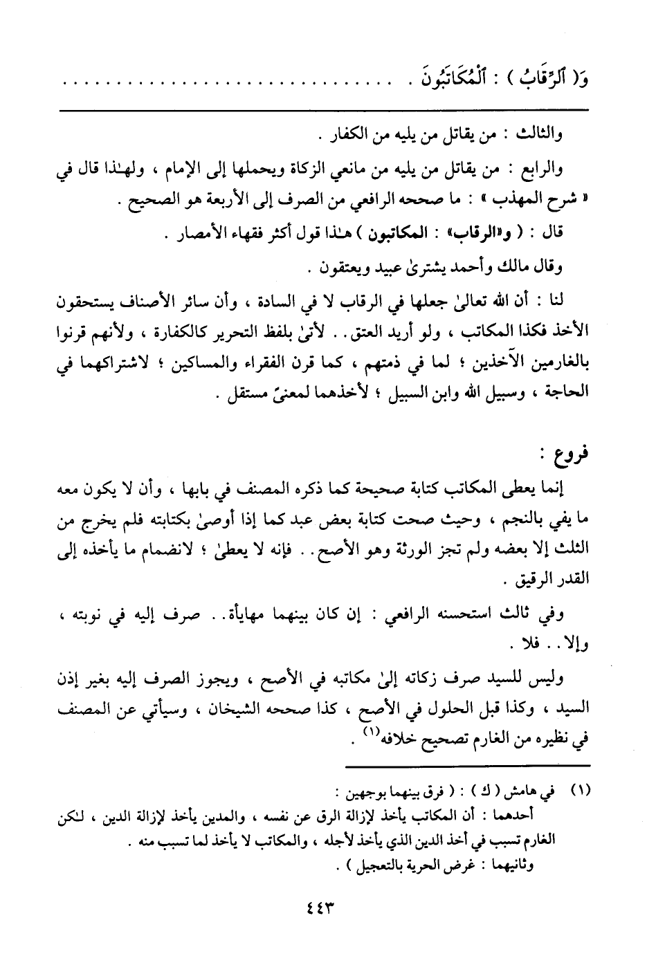 وليس للسيد صرف زكاته إلى مكاتبه في الأصح، ويجوز الصرف إليه بغير إذن السيد، وكذا قبل الحلول في الأصح، كذا صححه الشيخان، وسيأتي عن المصنف في نظيره من الغارم تصحيح خلافه.