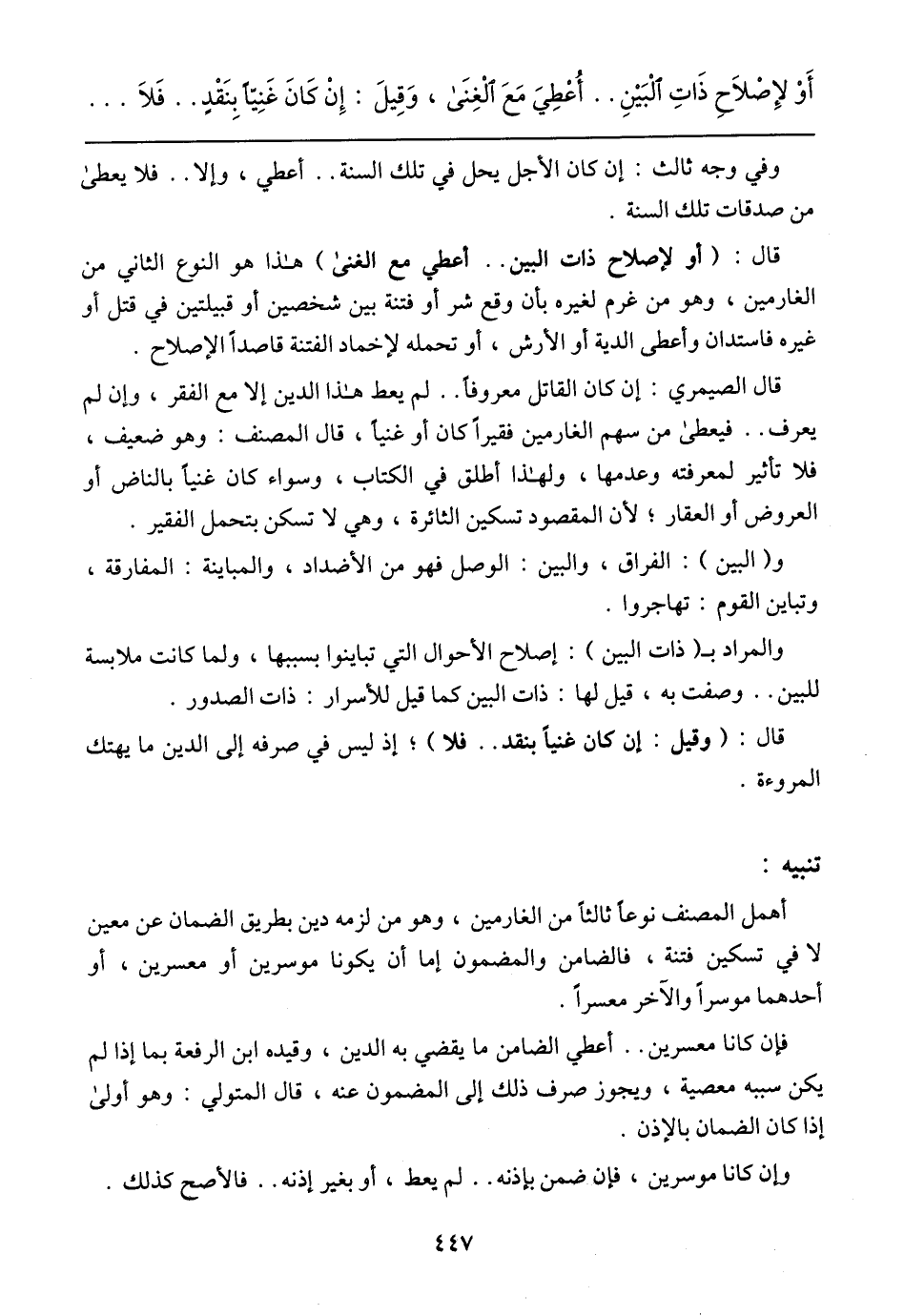 قال: (أو لإصلاح ذات البين .. أعطي مع الغنى) هذا هو النوع الثاني من الغارمين، وهو من غرم لغيره بأن وقع شر أو فتنة بين شخصين أو قبيلتين في قتل أو غيره فاستدان وأعطى الدية أو الأرش، أو تحمله لإخماد الفتنة قاصدًا الإصلاح.