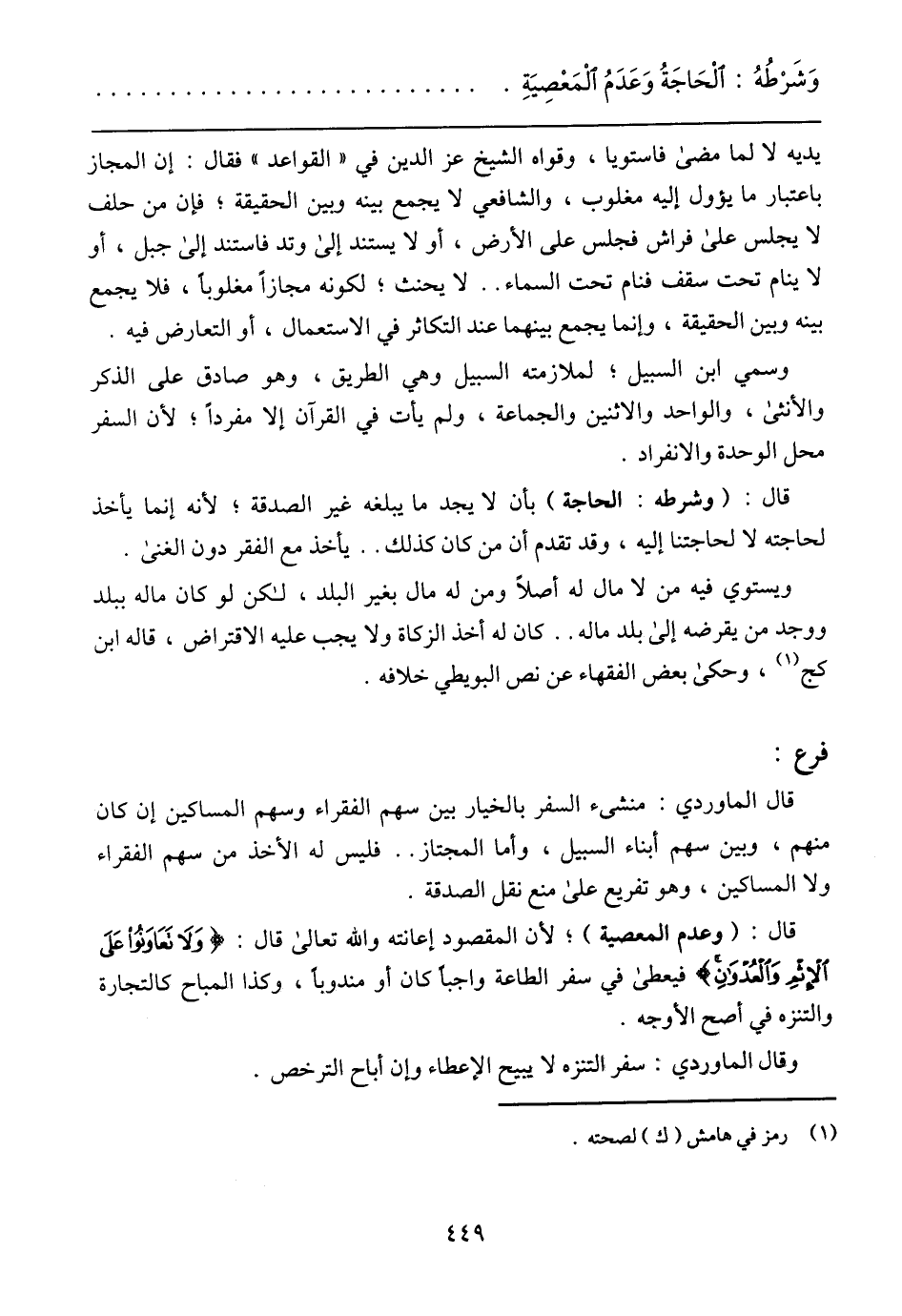 وَشَرْطُهُ: الْحَاجَةُ وَعَدَمُ الْمَعْصِيَةِ
