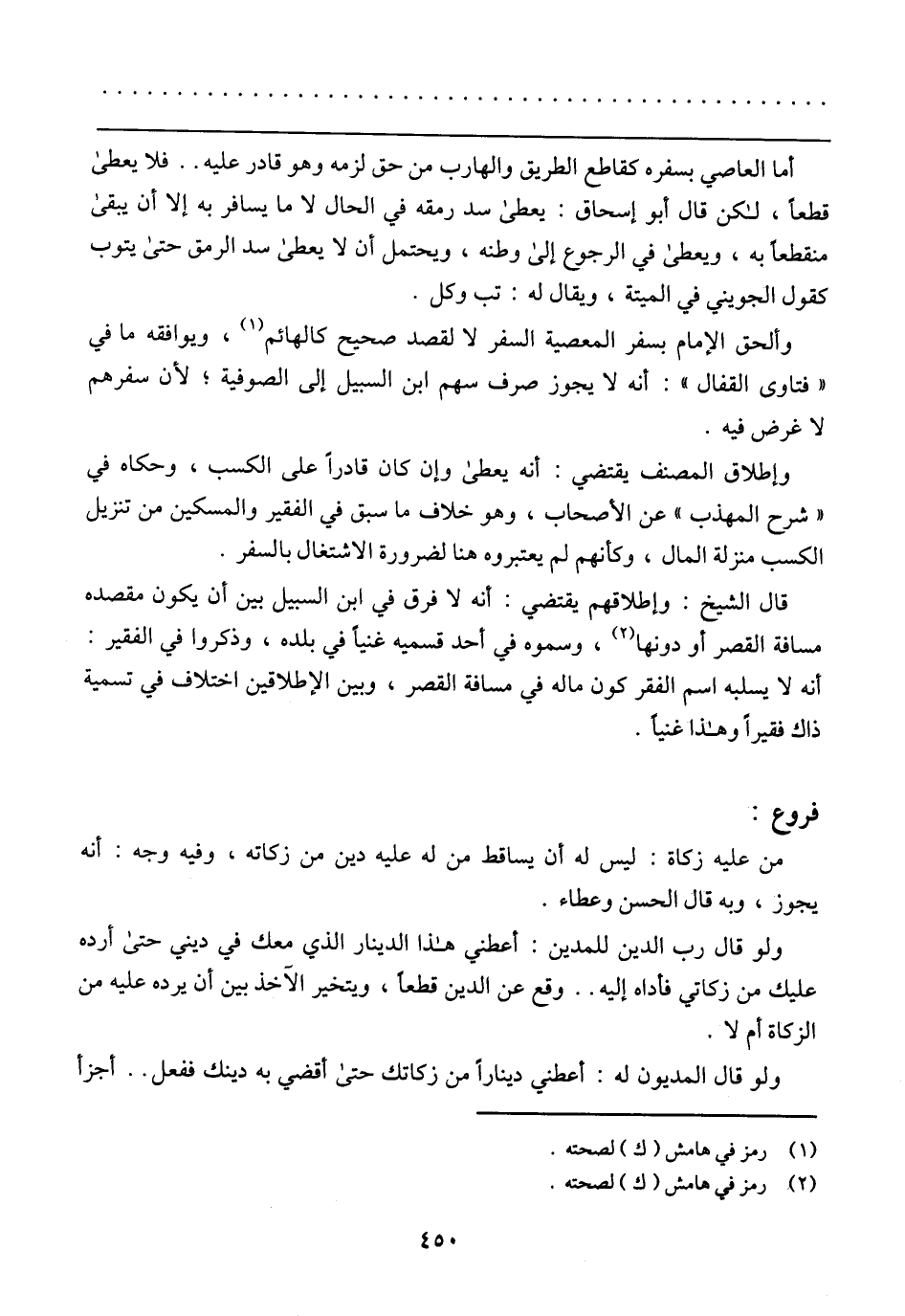 أما العاصي بسفره كقاطع الطريق والهارب من حق لزمه وهو قادر عليه .. فلا يعطى قطعًا، لكن قال أبو إسحاق: يعطى سد رمقه في الحال لا ما يسافر به إلا أن يبقى منقطعًا به، ويعطى في الرجوع إلى وطنه، ويحتمل أن لا يعطى سد الرمق حتى يتوب كقول الجويني في الميتة، ويقال له: تب وكل.