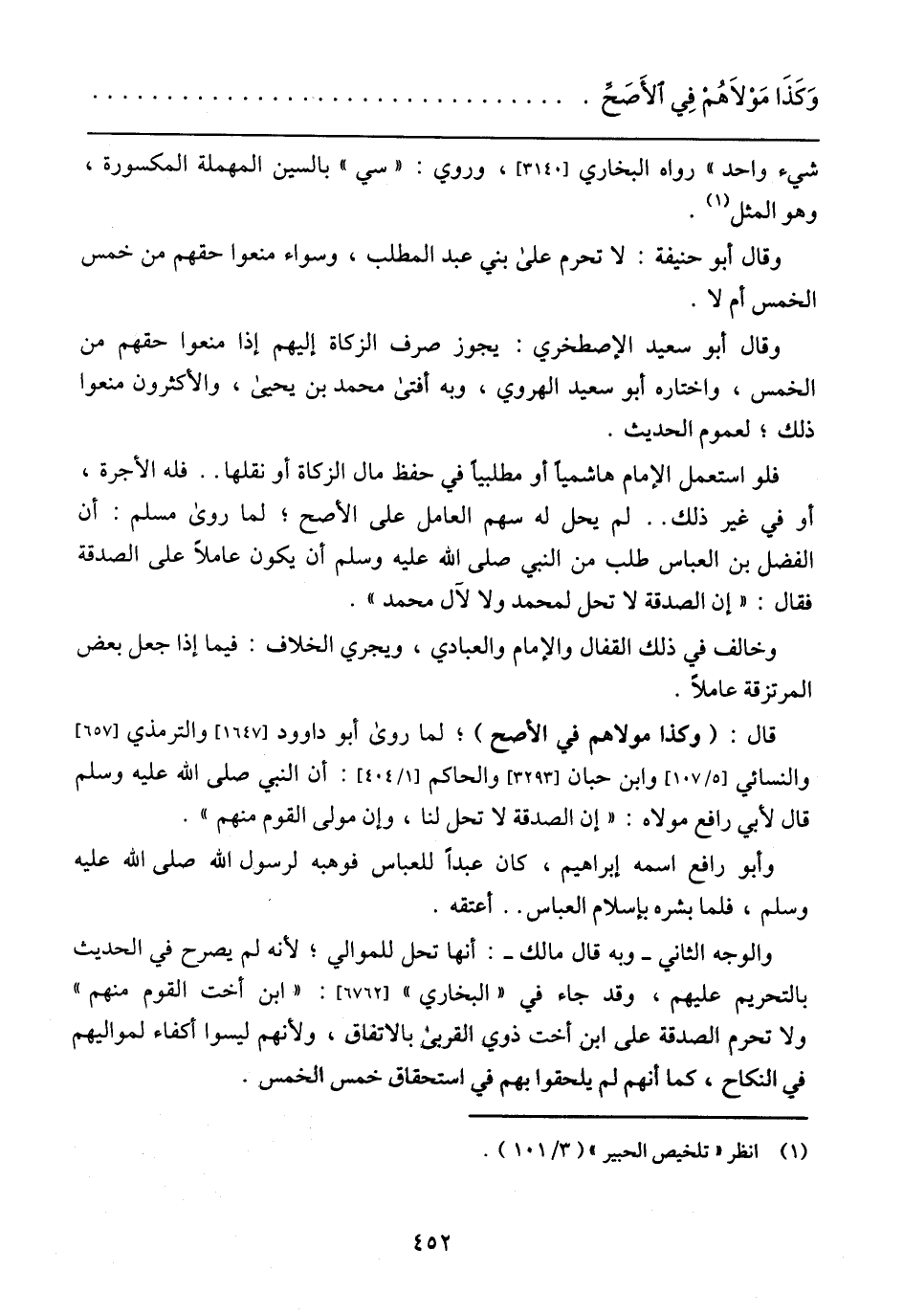 قال: (وكذا مولاهم في الأصح)؛ لما روى أبو داوود والترمذي والنسائي وابن حبان والحاكم: أن النبي صلى الله عليه وسلم قال لأبي رافع مولاه: (إن الصدقة لا تحل لنا, وإن مولى القوم منهم).