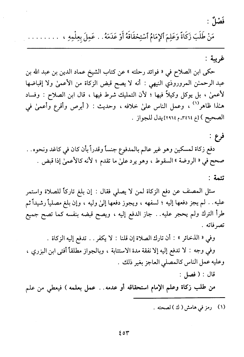 سئل المصنف عن دفع الزكاة لمن لا يصلي فقال: إن بلغ تاركًا للصلاة واستمر عليه .. لم يجز دفعها إليه؛ لسفهه, ويجوز دفعها إلى وليه, وإن بلغ مصليًا رشيدًا ثم طرأ الترك ولم يحجز عليه .. جاز الدفع إليه, ويصح قبضه بنفسه كما تصح جميع تصرفاته.