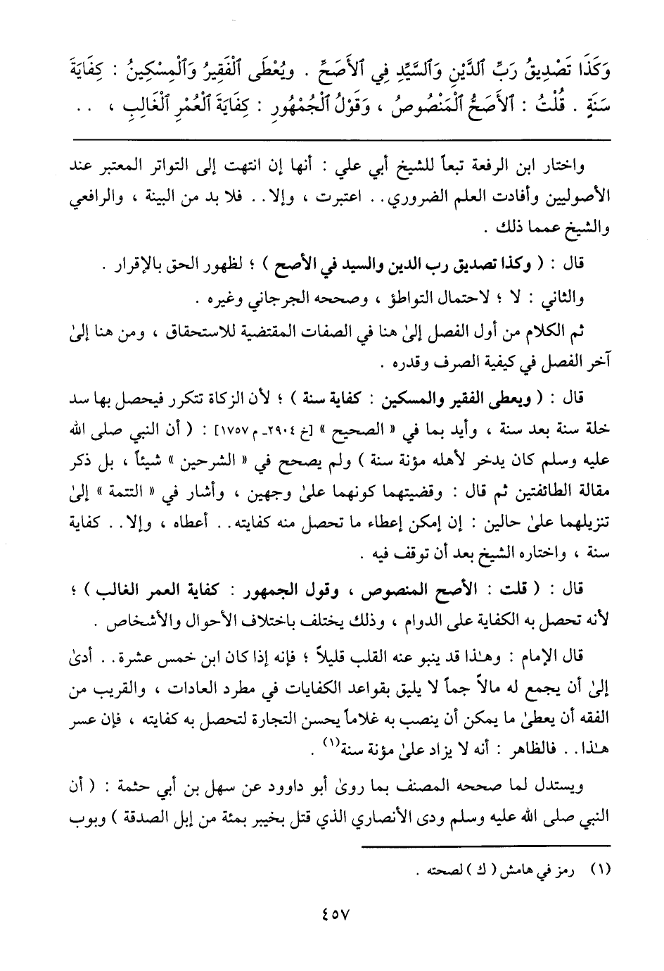وَكَذَا تَصْدِيقُ رَبِّ الدَّيْنِ وَالسَّيِد فِي الأَصَحّ. ويُعطَى الْفَقِيرُ وَالمِسْكِينُ: كِفَايَةَ سَنَةِ. قُلْتُ: الأَصَحُّ المَنْصُوصُ, وَقَوْلُ الْجُمْهُورِ: كِفَايَةَ العُمْرِ الْغَالِبِ,