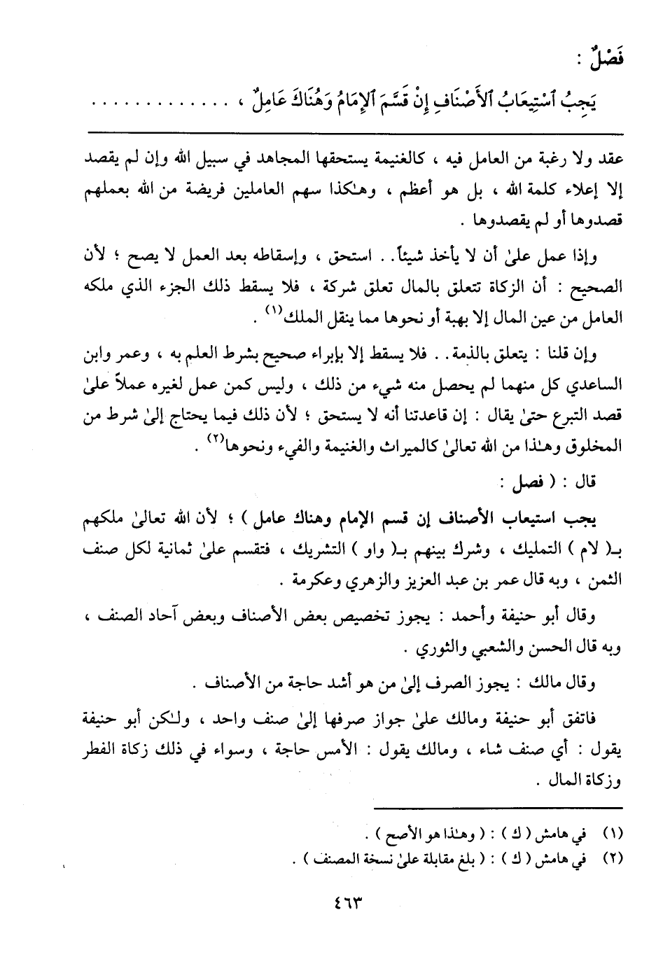 يجب استيعاب الأصناف إن قسم الإمام وهناك عامل)؛ لأن الله تعالى ملكهم بـ (لام) التمليك، وشرك بينهم بـ (واو) التشريك، فتقسم على ثمانية لكل صنف الثمن، وبه قال عمر بن عبد العزيز والزهري وعكرمة.